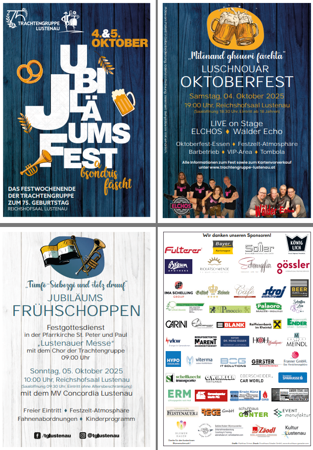Zum Festwochenende der Trachtengruppe Lustenau anlässlich ihres 75. Geburtstags wird am 4. und 5. Oktober in den Reichshofsaal in Lustenau geladen. Am Samstagabend wird beim Luschnouar Oktoberfest in Festzelt-Atmosphäre gefeiert. Am Sonntag folgt dann ein Festgottesdienst in der Pfarrkirche St. Peter und Paul mit anschließendem Jubiläumsfrühschoppen im Saal. Die Trachtengruppe Lustenau lädt herzlich ein und freut sich auf das Jubiläumswochenende und viele Besucher!